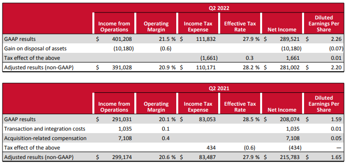 - 소득세 지출은 35% 증가한 1억 1,180만 달러를 기록했다. 2021년 2분기 28.5%에 비해 2022년 2분기 실효세율은 27.9%였다. 조정된 실효세율은 28.2%로 2021년 2분기(27.9%)보다 높았다.