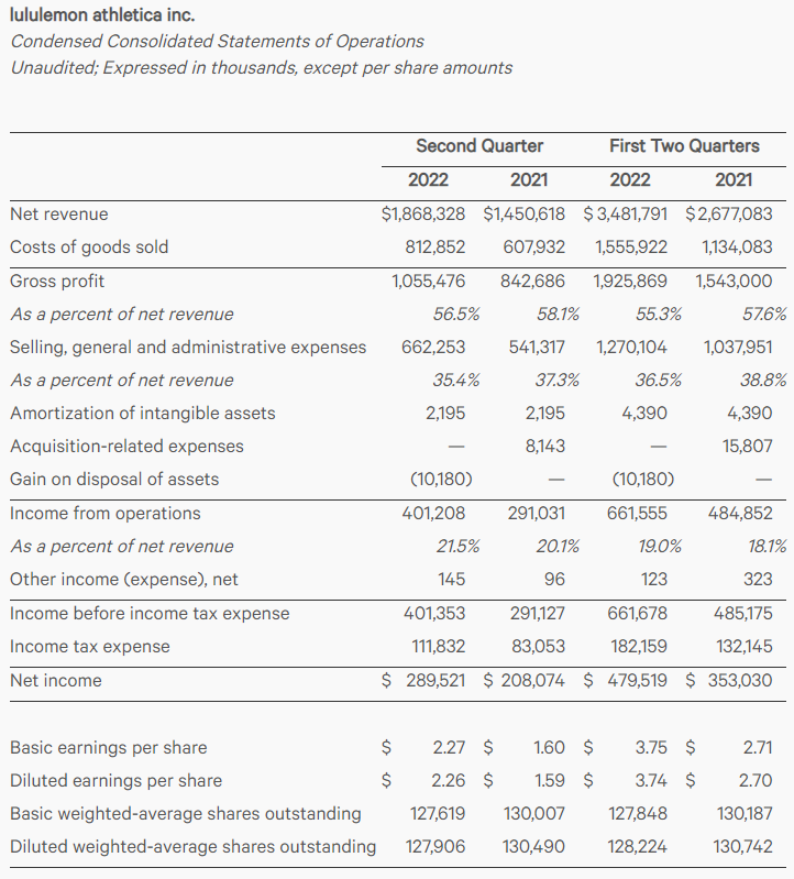 룰루레몬(LULU) 2022 Q2 실적발표 씸플어닝입니다.