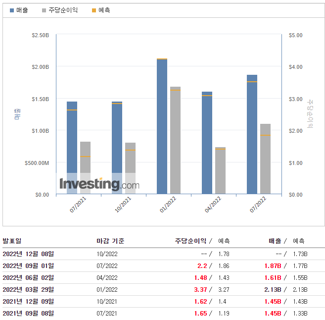 - 희석 주당 이익은 2019년 2분기 0.96달러에 비해 2.26달러였다. 조정된 희석 주당 이익은 2022년 2분기 2.20달러였다.