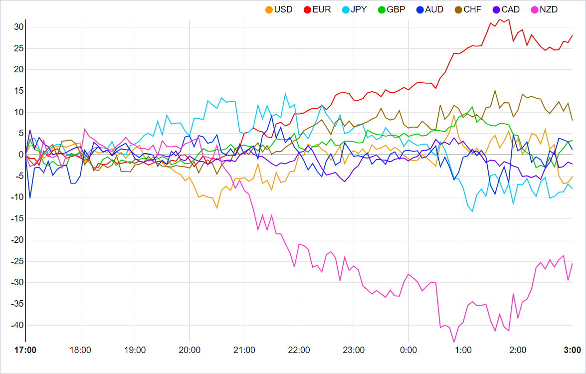 ✅통화 강도 차트: 가장 강함 - EUR, 가장 약함 - NZD.