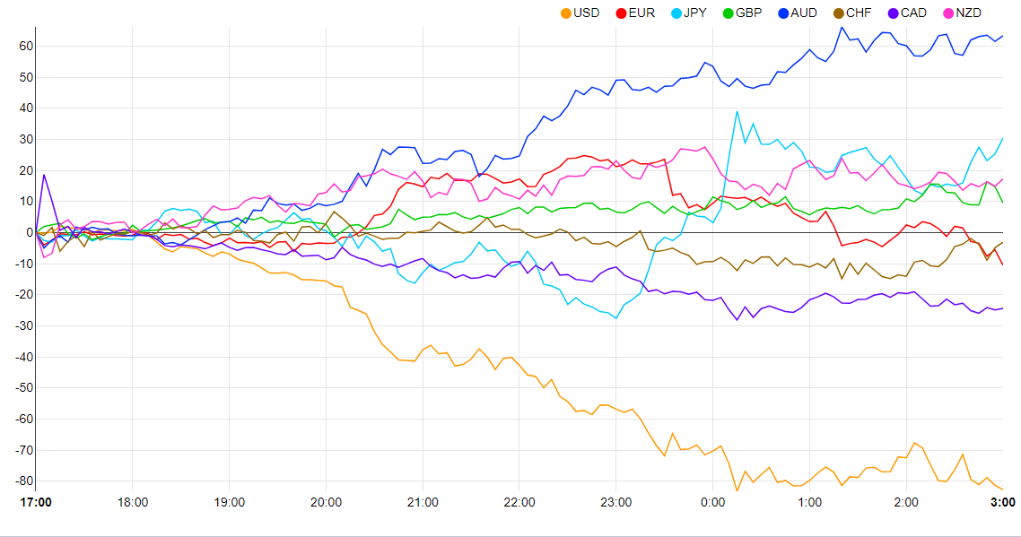 ✅통화 강세 차트: 가장 강한 - AUD, 가장 약한 - USD.