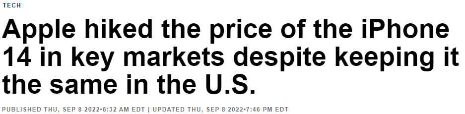 📌AAPL은 많은 주요 시장에서 아이폰 14 시리즈의 가격을 인상했지만 미국에서는 변동이 없었다.