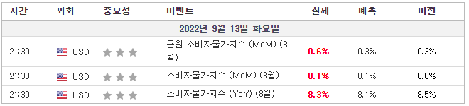 - 미국 CPI YoY 실제 8.3% (예측 8.1%, 이전 8.5%)