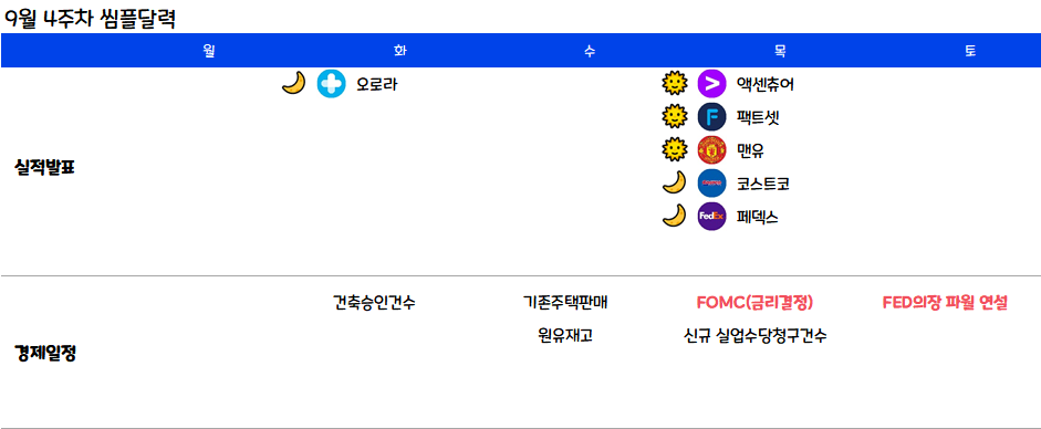 9월 4주차 미국 주요 경제일정 및 실적발표일, 씸플달력입니다.