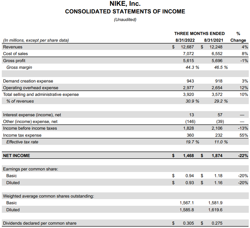 - NIKE, Inc.의 재고는 97억 달러로 전년 동기 대비 44% 증가했는데, 이는 공급망 변동성 지속으로 인한 운송 중 재고 증가로 인해 분기 중 소비자 수요 호조로 인해 부분적으로 상쇄되었기 때문이다.