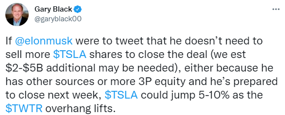 📌만약 엘론머스크가 거래를 성사시키기 위해 $TSLA 주식을 더 팔 필요가 없다고 트윗한다면(2-50억 달러가 추가로 필요할 것으로 예상됨), 그는 다른 출처가 있고 다음 주에 거래를 성사시킬 준비가 되어 있기 때문에 $TWTR 오버행 리프트로 $TSLA가 5-10% 급등할 수 있습니다.