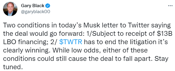 📌오늘 머스크가 트위터에 보낸 서한에서 거래가 진행될 것이라고 밝힌 두 가지 조건: