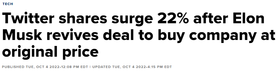 ✅일론 머스크가 회사를 원래 가격으로 매입하는 거래를 부활시킨 후 트위터 주가는 22% 급등했다.