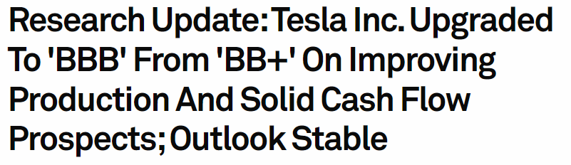 📌우리는 발행사 신용등급과 발행수준 등급을 포함한 테슬라의 등급을 'BB+'에서 'BBB'로 상향 조정했습니다.