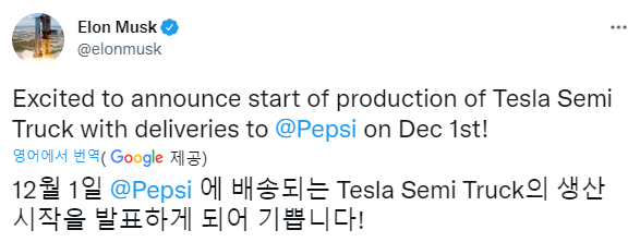 📌일론 머스크가 트윗으로 테슬라 세미 트럭이 12월부터 펩시에 배송되고 생산을 시작한다 발표