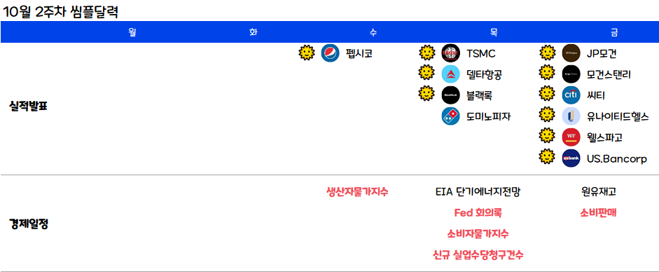 10월 2주차 미국 주요 경제일정 및 실적발표일, 씸플달력입니다.