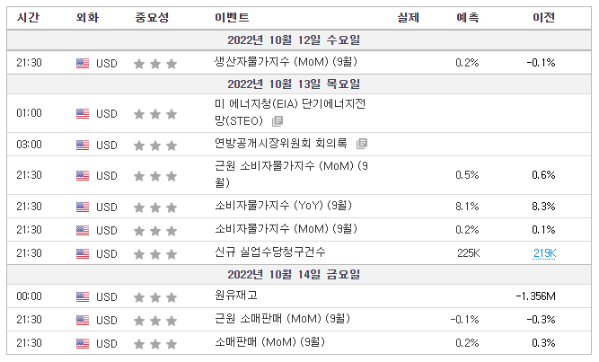 | 10월 3주차 미국 주요 경제일정 및 실적발표일📆 (0) | 2022.10.17 |