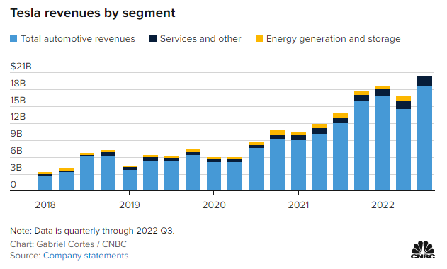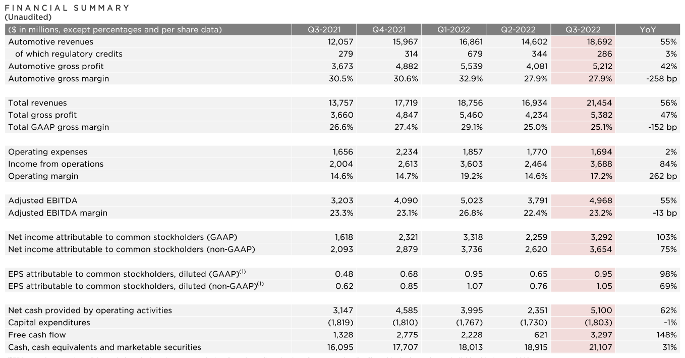 - 테슬라의 2022년 3분기 순이익(GAAP)은 33억3000만달러에 달했으며 자동차 총마진은 정확히 2022년 2분기 수준인 27.9%를 유지했다. 테슬라는 지난해 같은 기간 16억2000만달러의 이익을 냈다.
