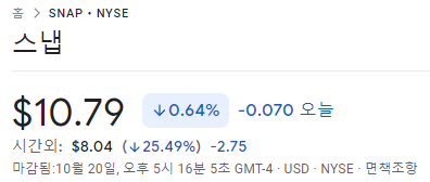 🔥스냅의 실적발표 이후 폭락, 광고주(구글, 메타) 같이 애프터장 하락중