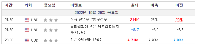 - 미국 최초 실업수당 청구실제 214k(예측 231.5k, 이전 228k)