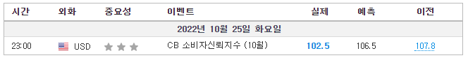 - 미국 CB 컨슈머 컨피던스 액츄얼 102.5 (예측 105.9, 이전 108.0)