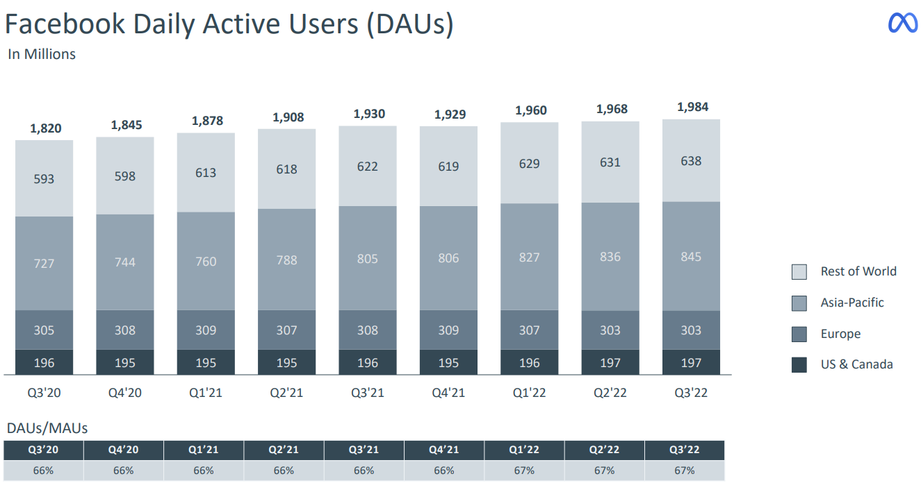 - 페이스북 일일 활성 사용자(DAU) – 2022년 9월 평균 DAU는 19억 8천만 명으로 전년 동기 대비 3% 증가했습니다.