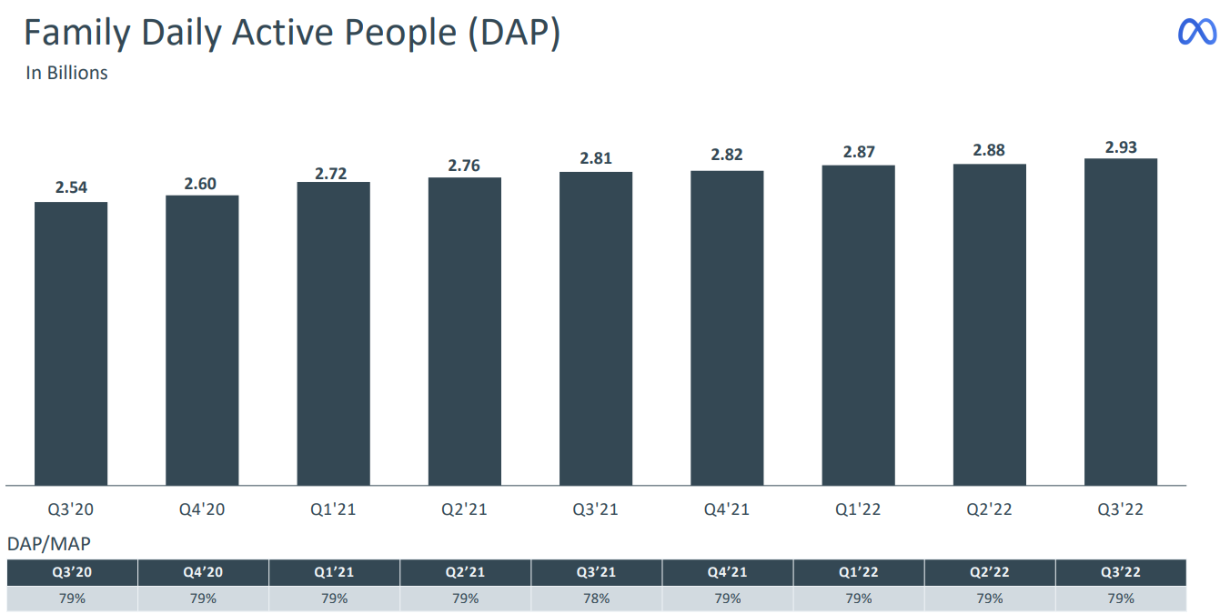 - Family 일일 활동 인구(DAP) – DAP는 2022년 9월 평균 29억 3천만 명으로 전년 동기 대비 4% 증가했습니다.