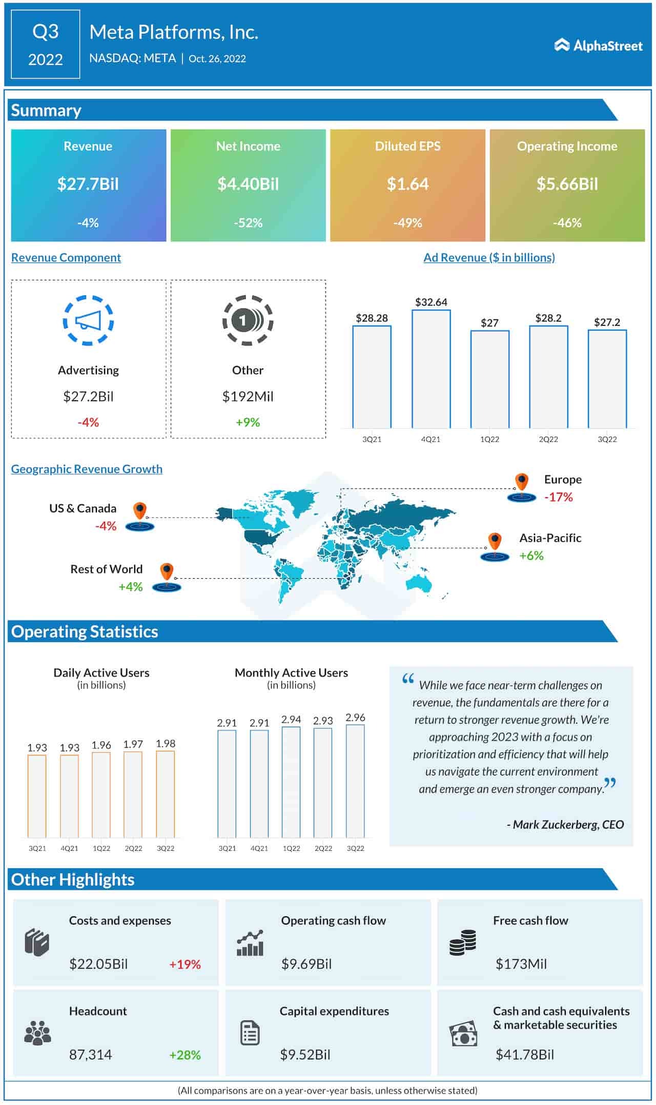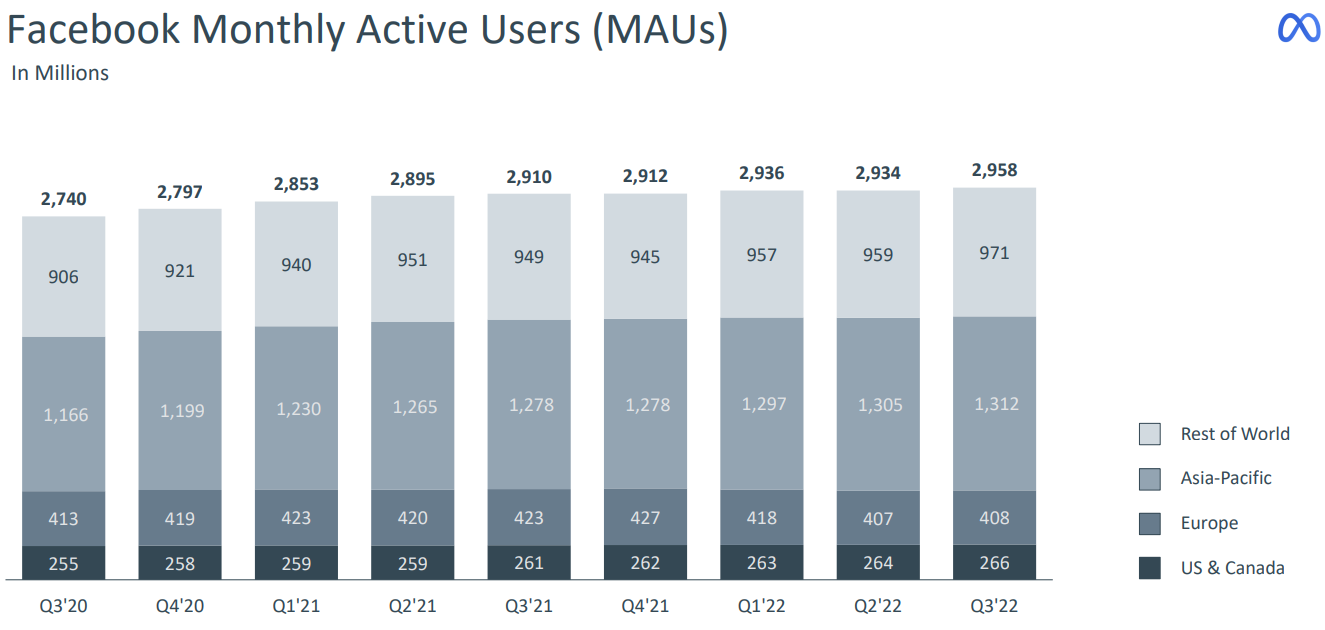 - 페이스북 월간 활성 사용자(MAU) – 2022년 9월 30일 현재 MAU는 29억 6천만 명으로 전년 동기 대비 2% 증가했습니다.