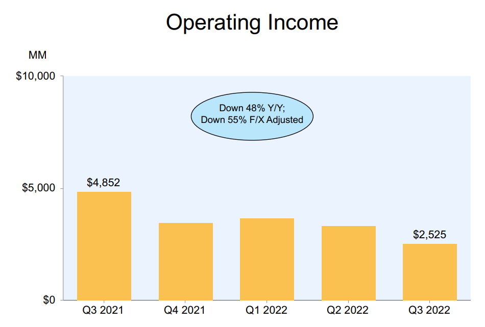 - 영업이익은 2021년 3분기 49억 달러에서 3분기 25억 달러로 줄었다.