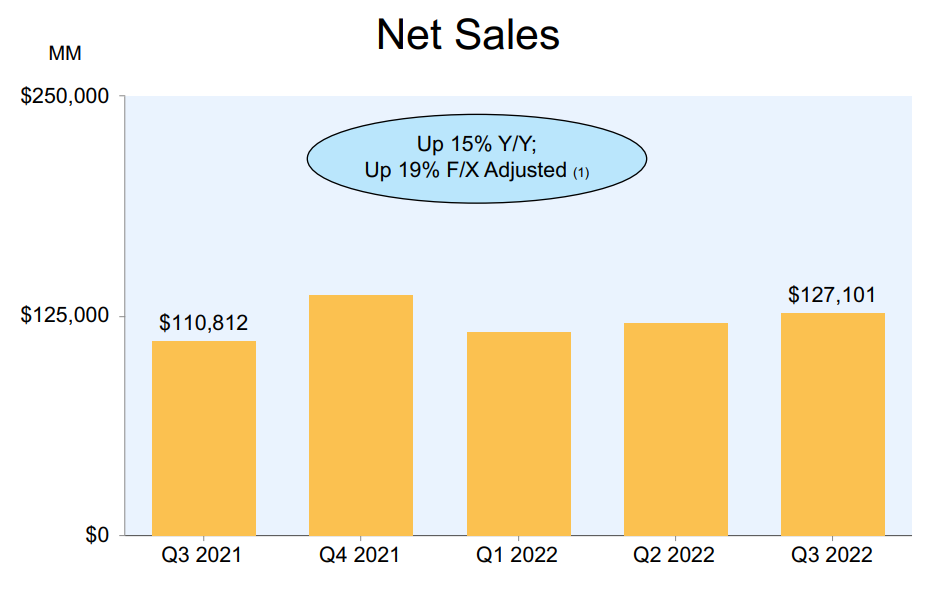 - 분기 내내 전년 동기 대비 환율 변동으로 인한 50억달러의 부정적 영향을 제외하면 2021년 3분기 대비 순매출은 19% 증가했다.
