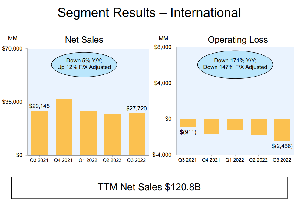 - 국제 부문 매출은 277억 달러로 전년 동기 대비 5% 감소했지만 환율 변동을 제외하면 12% 증가했다.