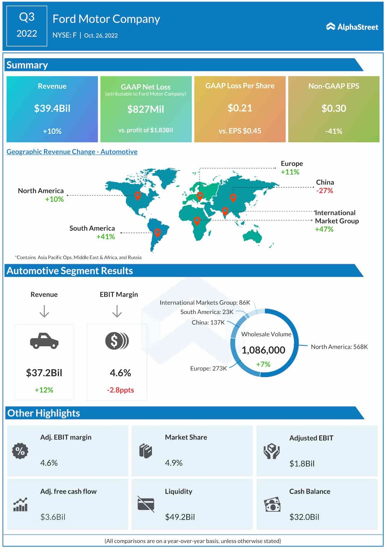 - 공급망 문제에도 불구하고 10% 증가한 394억 달러의 분기별 매출 보고, 특수 품목의 결과로 인한 8억 2700만 달러의 순손실, 조정된 EBIT18억 달러의로, 최근 지침을 초과 달성