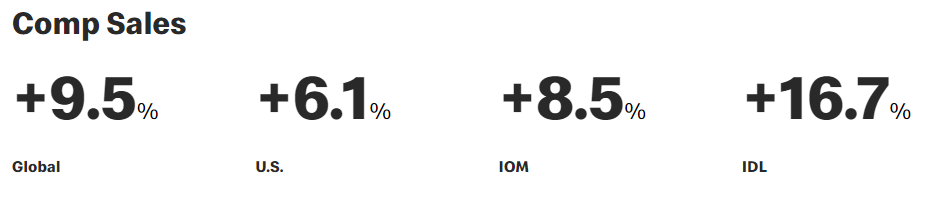 - 전 세계 비교 가능 매출이 9.5% 증가하여 모든 부문에서 긍정적인 비교 가능 매출을 반영했습니다.