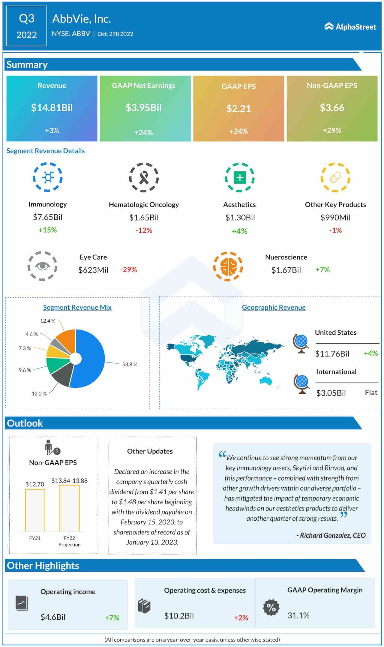 - 보고서 3분기 희석 GAAP 기준 EPS 2.21달러, 24.2% 증가. 조정 희석액 EPS는 3.66달러로 29.3% 증가했습니다. 이러한 결과에는 인수된 IPR&D 및 마일스톤 비용과 관련된 주당 0.02달러의 불리한 영향이 포함됩니다.