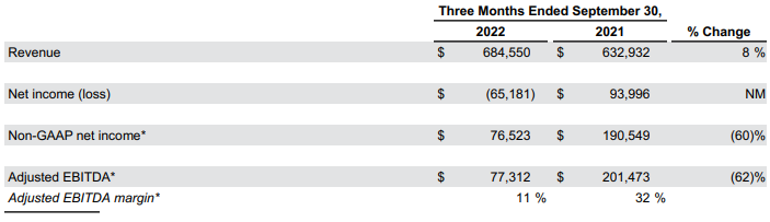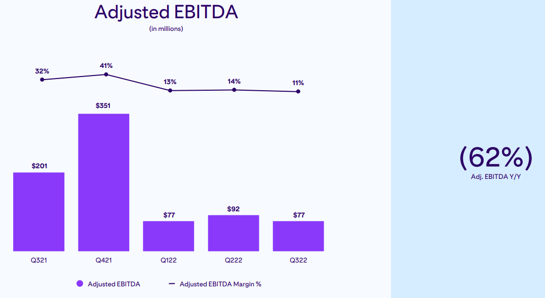- GAAP 순손실은 3분기에 6,500만 달러였습니다. 조정된 EBITDA는 3분기에 7,700만 달러였습니다.