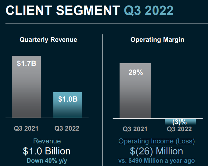 - 취약한 PC 시장 및 PC 공급망 전반에 걸친 상당한 재고 조정으로 인한 프로세서 출하 감소로 인해 고객 부문 매출이 감소