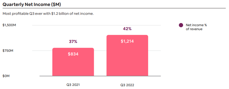 - 3분기 순이익 12억 달러는 사상 최대 수익이었다. 순이익은 2021년 3분기에 비해 3억 8천만 달러가 개선되었는데, 이는 주로 우리의 수익 증가와 지출 규율 덕분입니다. 2022년 3분기에는 2021년 3분기 37%에서 42%의 순이익 마진을 달성했으며, 최근 12개월 동안 16억 달러의 순이익이 발생했습니다.