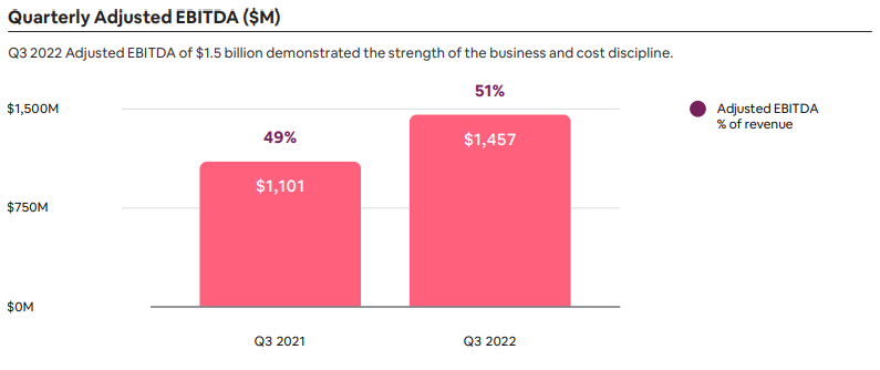 - Q3 조정된 15억 달러의 EBITDA가 최고였다. 2022년 3분기 조정된 EBITDA는 2021년 3분기 11억 달러에 비해 32% 증가했다. 조정된 EBITDA 마진은 2021년 3분기 49%에서 2022년 51%로 증가했다. 조정된 EBITDA의 이러한 추가적인 개선은 비용 구조를 관리하는 데 있어 우리 비즈니스의 지속적인 강점과 규율을 보여줍니다.