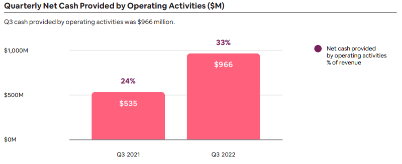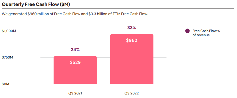 - 2022년 3분기 영업활동으로 제공되는 순현금은 9억 6,600만 달러로 2021년 3분기 5억 3,500만 달러보다 증가했다. 현금 흐름의 증가는 수익 증가와 순이익 확대에 의해 주도되었다. TTM FCF는 33억 달러로 41%의 TTM FCF 마진을 보였습니다.