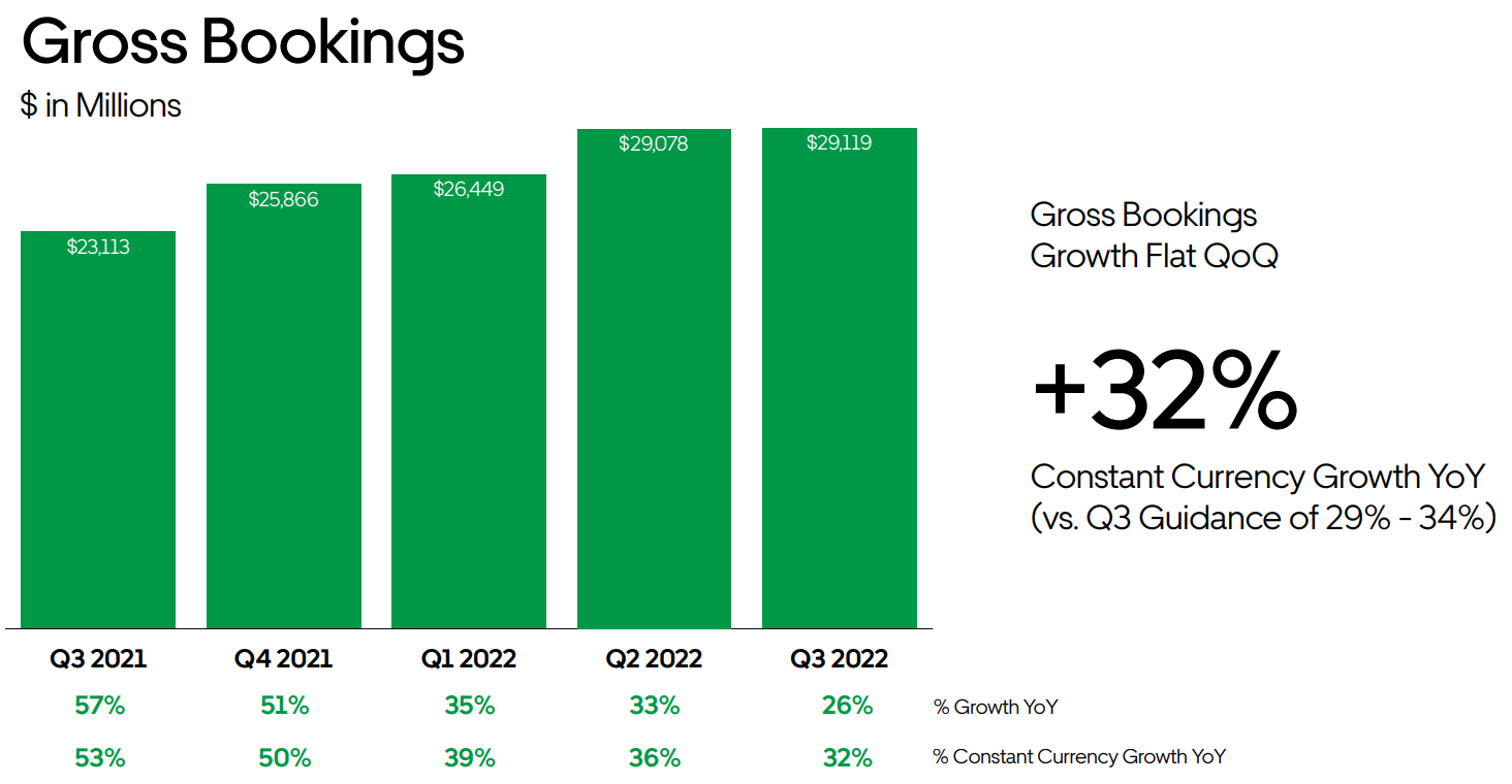 - 총 예약(YoY)은 전년 대비 26% 증가한 291억 달러(일정 통화 기준 32%)를 기록했으며, 모빌리티 총 예약은 137억 달러(+38% YoY 또는 +45% YoY 고정 통화)와 배달 총 예약은 137억 달러(+7% YoY 또는 +13% YoY 고정 통화 기준)로 집계됐다. 분기 동안 여행 횟수는 19% 증가한 19억 5천만 회, 즉 하루 평균 약 2,100만 회에 달했습니다.