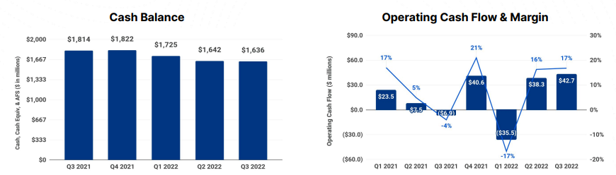 - 현금, 현금 등가물 및 매도가능증권은 2022년 9월 30일 현재 1,636.3만 달러입니다.