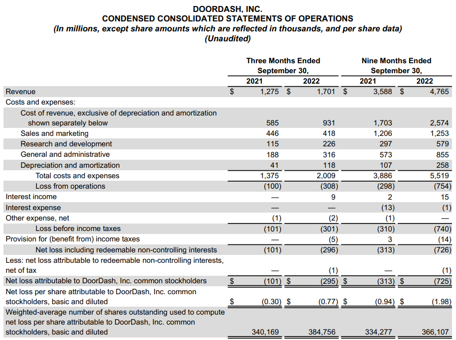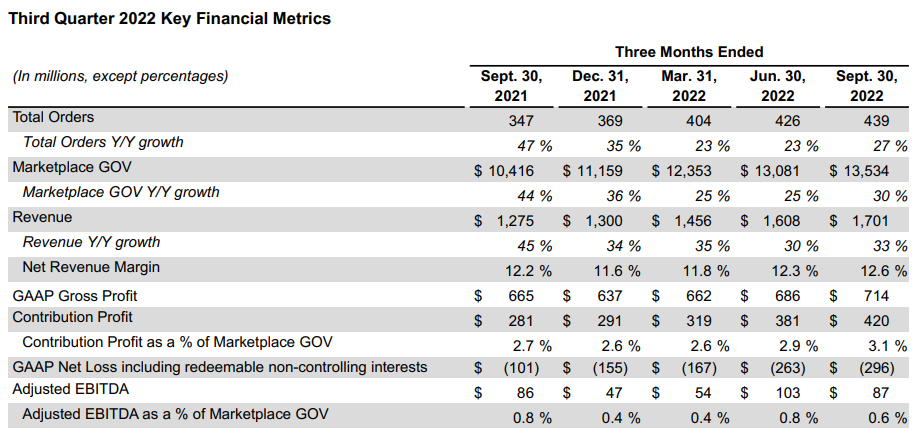 - 매출은 DoorDash 매출의 25% 성장과 Wolt의 추가에 힘입어 2022년 3분기에 13억 달러에서 17억 달러로 33% 증가했습니다.