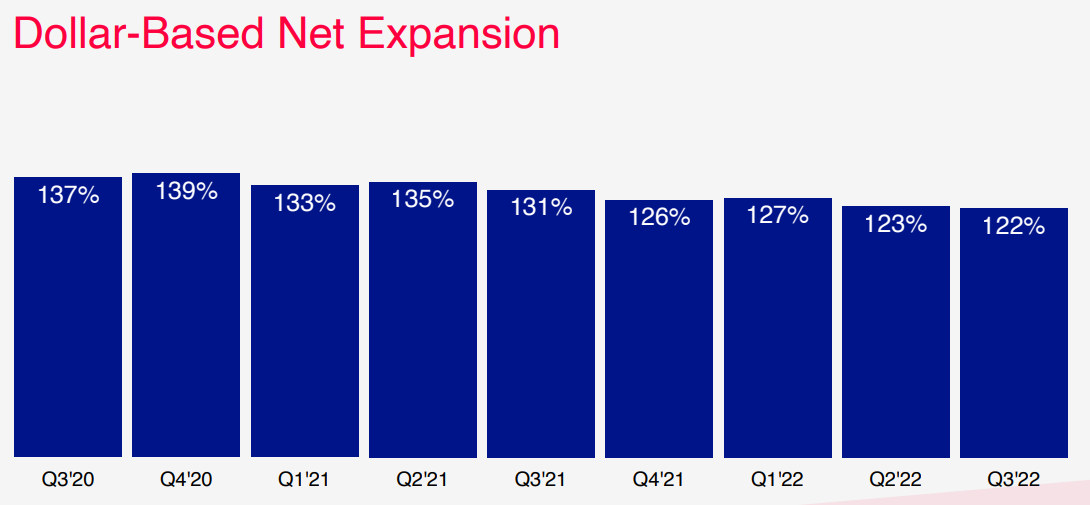 - 달러 기반 순 확장율은 2021년 3분기 131%와 비교하여 2022년 3분기 122%였습니다. Zipwhip을 포함하여 2021년 7월 1일 이후에 마감된 인수의 결과는 이 지표의 계산에 영향을 미치지 않습니다. 기간.