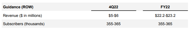 📌우리는 2022년 4분기 5.0 - 600만 달러의 수익을 안내하고 있습니다. 이는 이전의 연간 지침과 일치하는 2220만 - 2320만 달러의 2022 회계연도 수익을 의미합니다. 또한 기존 34만~36만명에 비해 35만5000~3만5000명의 연말 총 가입자를 대상으로 안내하고 있다. 북미 스트리밍 및 ROW 스트리밍에 대한 위의 지침은 오늘 현재 당사의 내부 예측을 반영한다는 점에 유의하십시오. 무엇보다 현재의 거시경제 환경의 결과로 실제 운영 결과는 우리의 지침과 크게 다를 수 있습니다.