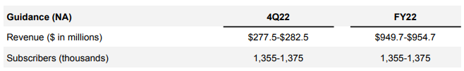 📌우리의 2022년 4분기 지침은 중간 시점에서 전년 동기 대비 22% 성장을 나타내는 135만 5천 - 137만 5천 명의 가입자와 중간 시점에서 전년 동기 대비 22% 성장을 나타내는 2억 7,750만 - 2억 8,250만 달러의 수익을 예상한다. 이는 전년도 연말 가입자 안내인 133만-135만명을 상향 조정한 것을 반영한 것이다. 1년 내내, 우리는 또한 9억 1천만 - 9억 3천만 달러의 이전 연간 수익 지침과 비교하여 중간 시점에서 전년 대비 50%의 성장을 나타내는 9억 4천 770만 - 9억 5천 4백 7십만 달러로 이전 수익 지침을 업데이트하고 있습니다. 이전 연간 지침의 상향 조정은 2022년 3분기 실적과 2022년 4분기 가입자 증가의 지속적 강세에 대한 기대를 고려합니다.