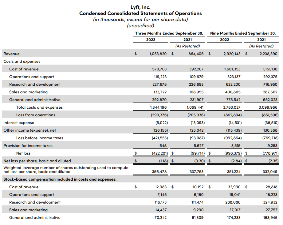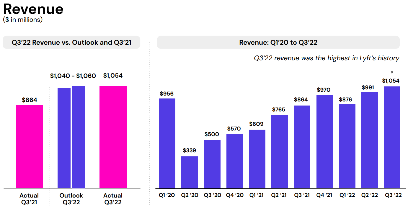 - 리프트는 3분기 매출이 전년 동기 대비 22% 증가한 10억5380만 달러, 2021년 3분기 8억6440만 달러, 2022년 2분기 9억9070만 달러로 분기 대비 6% 증가했다고 보고했다.