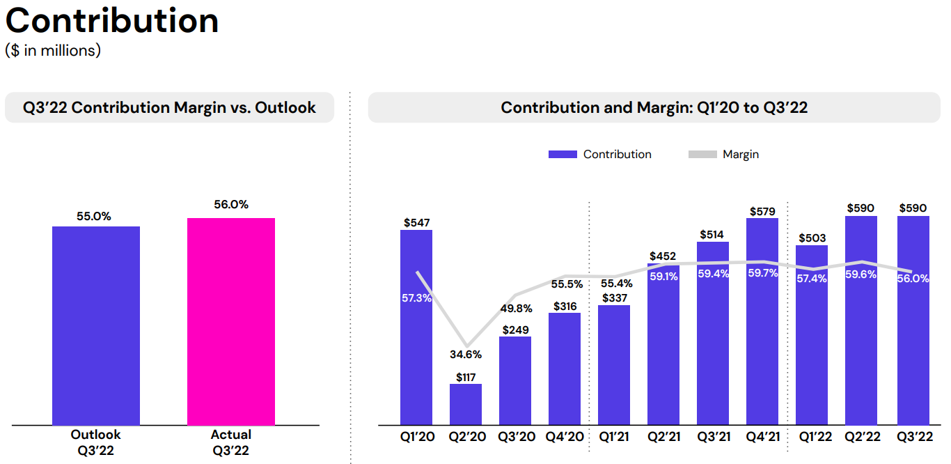 - 리프트는 2021년 3분기 5억 1,360만 달러 대비 2022년 3분기 기여도가 5억 9,040만 달러로 전년 동기 대비 15% 증가했으며 2022년 2분기에는 5억 9,050만 달러 대비 상대적으로 낮은 증가율을 기록했다고 보고했다. 2022년 3분기 기여 마진은 56.0%로 회사의 전망을 웃돌았다.