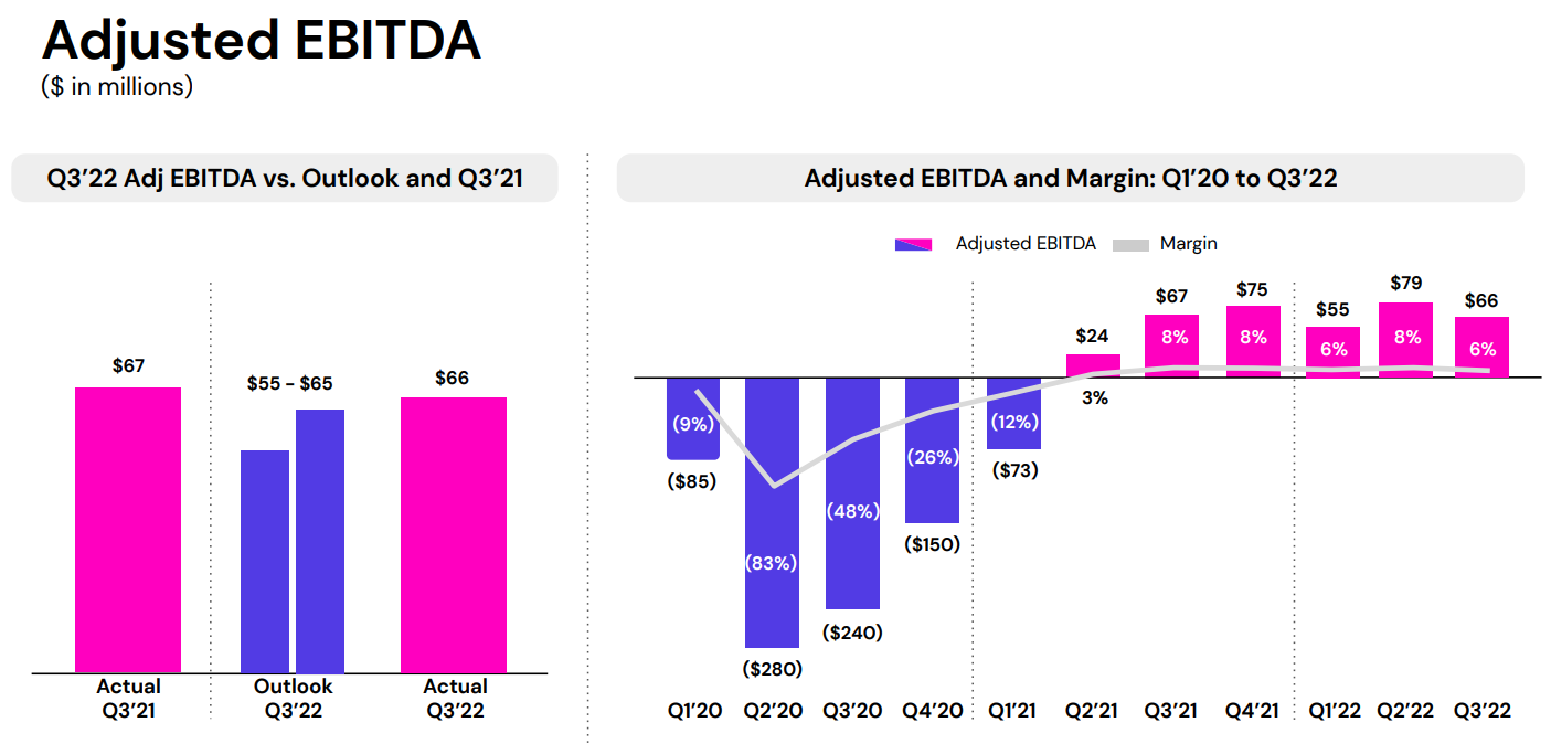 - 2022년 3분기 조정된 EBITDA는 2021년 3분기 6730만 달러와 2022년 2분기 7910만 달러 대비 6620만 달러였다. 2022년 3분기 조정된 EBITDA는 회사의 전망을 초과했습니다. 2022년 3분기 조정된 EBITDA 마진은 2021년 3분기 조정된 EBITDA 마진 7.8%, 2022년 2분기 8.0%에 비해 6.3%였다.