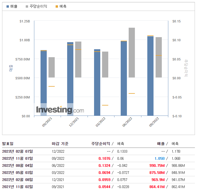 - 매출원가를 뺀 매출로 정의되는 총이익은 2022년 3분기 4억8310만달러로 2021년 3분기 4억7220만달러에 비해 전년 동기 대비 2% 증가했고, 2022년 2분기 3억4040만달러로 분기 대비 42% 증가했다. 2021년 3분기 54.6%, 2022년 2분기 34.4%에 비해 2022년 3분기 총이익률은 45.8%였다.