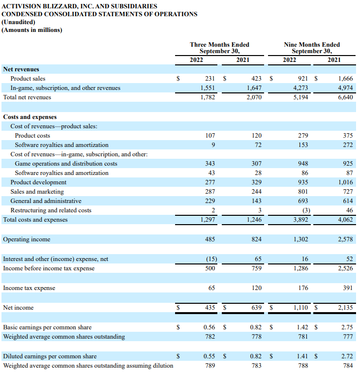 - GAAP에 따라 제시된 액티비전 블리자드의 순이익은 17억 8천만 달러였으며 2021년 3분기에는 20억 7천만 달러였다.