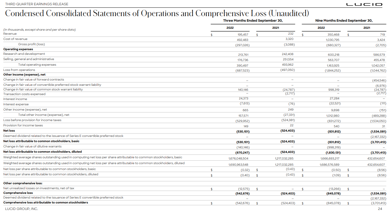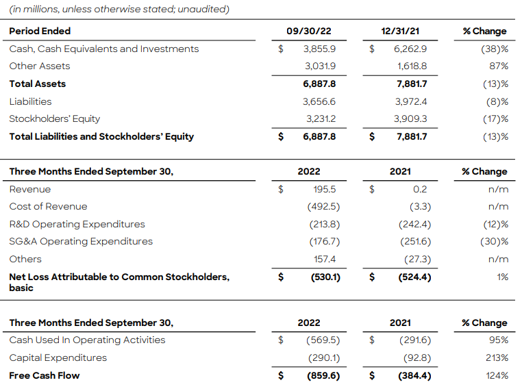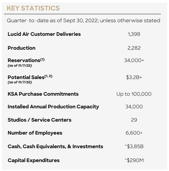 - 루시드는 2022년 3분기를 38억 5천만 달러의 현금, 현금 등가물 및 투자로 마감했습니다. 우리는 적어도 2023년 4분기까지는 이것을 충분한 유동성으로 계속 보고 있다.
