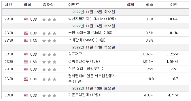 | 11월 4주차 미국 주요 경제일정 및 실적발표일📆 (0) | 2022.11.21 |
