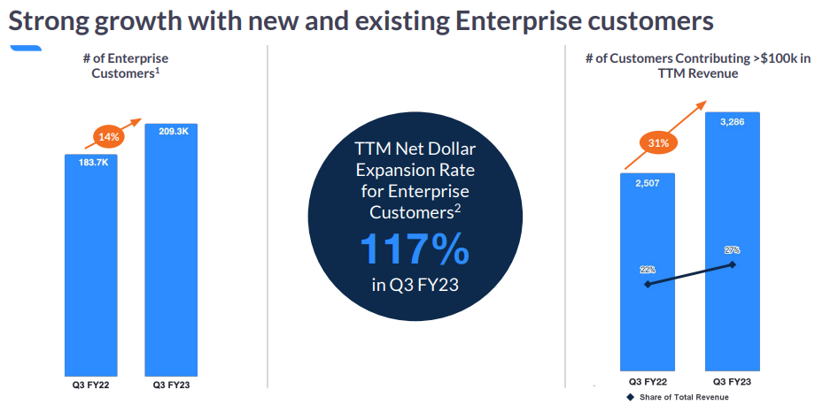- 고객 메트릭: 엔터프라이즈 고객은 약 209,300명으로 작년 회계연도 같은 분기보다 14% 증가했습니다. 엔터프라이즈 고객의 12개월 순 달러 확장률은 117%입니다. 지난 회계연도 같은 분기보다 약 31% 증가한 3,286명의 고객이 12개월 동안 10만 달러 이상의 매출을 올렸다. 온라인 3분기 월평균 매출액은 3.1%로 지난해 같은 분기보다 60bps 감소했다.