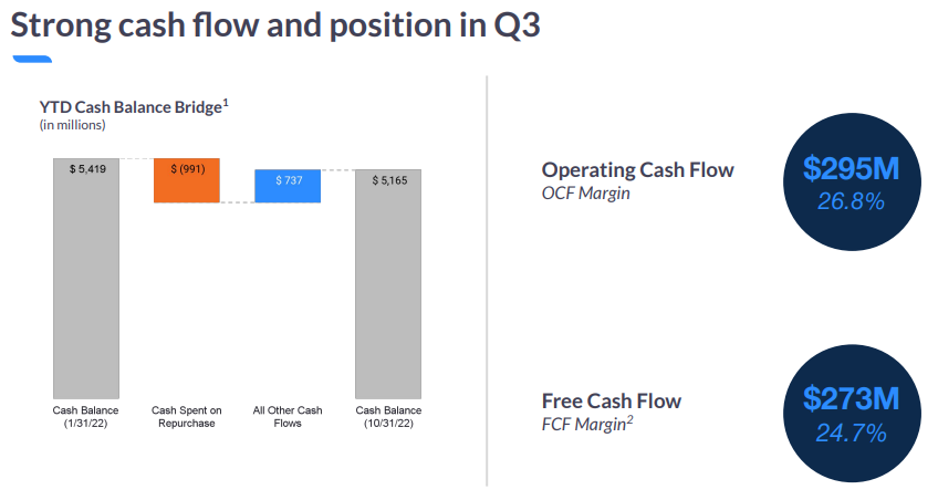 주식 기반 보상 비용 및 관련 급여 세금, 전략 투자 손실(이득), 순, 인수 관련 비용, 참여 증권에 귀속되는 미배당 수익 및 비GAAP 조정에 대한 세금 효과를 조정한 후 3분기 비GAAP 순이익은 3억 2,320만 달러였습니다. 비GAAP 주당 순이익은 1.07달러였다. 2022 회계연도 3분기 비GAAP 순이익은 주당 1.11달러인 3억3840만 달러였다.