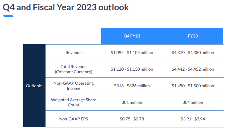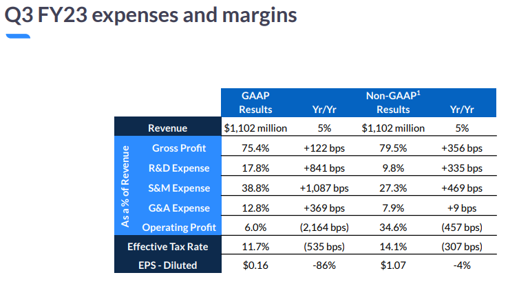 - 영업 및 영업 마진 수익: 3분기 영업 수익은 6,650만 달러였으며, 2022 회계연도 3분기 영업 수익은 2억 9,090만 달러였습니다. 주식 기반 보상 비용과 관련 급여 및 취득 관련 비용을 조정한 후, 3분기 영업에서 발생한 비GAAP 소득은 3억 890만 달러로 2022 회계연도 3분기 영업에서 발생한 비GAAP 소득은 4억 1,130만 달러였다. 3분기에 GAAP 영업이익률은 6.0%, 비GAAP 영업이익률은 34.6%였다.